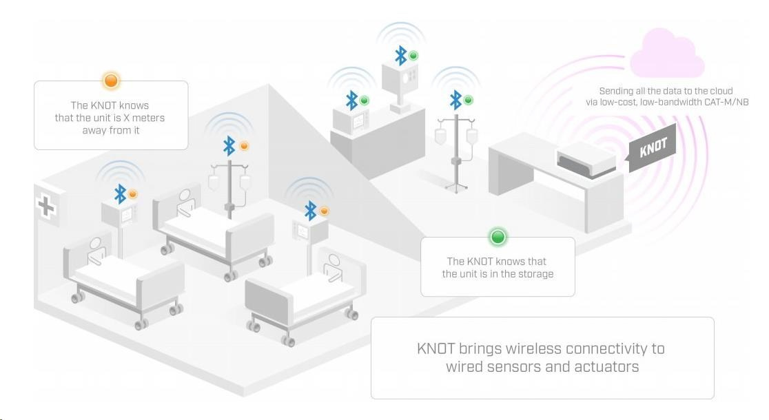 KNOT může monitorovat integrované GPIO, převádět RS485/Modbus protokol na TCP/IP a také Bluetooth pakety na TCP/IP pomocí HTTPS či MQTT. KNOT mužete použít jako převoník z kabelových snímačů RS485/Modbus k odesílání údaju na server Modbus. Ano, KNOT prináší bezdrátové pripojení ke kabelovým senzorum a akčním členům, jako jsou elektroměry a relé. Například můžete spravovat prodejní automat se senzory teploty a vlhkosti napojený na KNOT s pouhými nekolika megabajty denně!