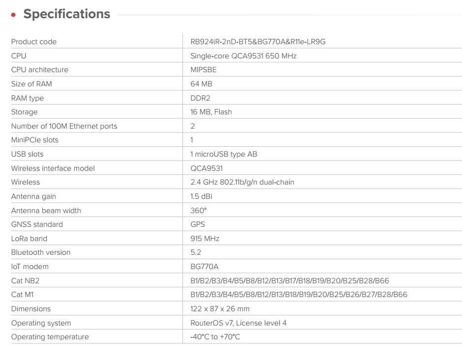 Brána IoT průmyslové třídy pro inteligentní sledování majetku, vzdálené monitorování a efektivní automatizaci - nyní s vylepšeným příjmem LoRa®, souběžným GPS + LTE CAT-M a nižší cenou. KNOT LR9G je kompaktní, ihned použitelná brána pro sítě založené na LoRa®, navržená tak, aby poskytovala cenově dostupnou a spolehlivou konektivitu i v těch nejodlehlejších prostředích. Podporuje LTE CAT-M1 a NB2, Bluetooth 5.2, 2,4 GHz Wi-Fi, GPS a Ethernet s PoE, což z něj činí flexibilní základ pro jakékoli nasazení IoT. Ať už sledujete cenná aktiva v nemocnici, spravujete prodejní automat v nákupním centru nebo monitorujete senzory na zemědělském poli. Funkce a vlastnosti: • Souběžné GPS a LTE CAT-M Sledujte pohybující se aktiva pomocí přesného GPS a zároveň udržujte živé připojení LTE CAT-M1. Ideální pro mobilní jednotky, jako jsou servisní vozidla, kontejnery nebo roamingové terénní zařízení. • Univerzální napájení Vyberte si z PoE-in, DC jack nebo MicroUSB – včetně PoE-out na Ether2 pro napájení dalších zařízení. • SMA konektory pro všechny hlavní rozhraní Snadné nastavení antény pro LTE, GPS a LoRa®. • Vylepšený příjem 915 MHz LoRa® Vylepšená citlivost pro silnější signál a delší dosah, i v prostředí s velkým rušením. • Nižší cena, stejná spolehlivost Cenově výhodné pro rozsáhlá nasazení bez snížení výkonu. • Poháněno RouterOS v7 Pro plnou kontrolu, vlastní skriptování a pokročilé funkce směrování. Příklady praktického nasazení: Sledování majetku nemocnice Připojte majáky Bluetooth ke kritickému zdravotnickému vybavení. Nainstalujte KNOT LR8G do každého skladovacího prostoru. Při pohybu zařízení KNOT detekuje blízké štítky, sleduje polohu pomocí GPS a odesílá aktualizace přes LTE CAT-M - udržuje aktuální stav inventáře a snižuje počet manuálních kontrol. Zemědělství a odlehlé lokality Nasaďte KNOT ke sběru dat z půdních nebo meteorologických senzorů na venkovských polích. Díky podpoře širokého pásma, příjmu LoRa® a kompatibilitě s GPS je ideální pro sběr dat na velké vzdálenosti a s nízkou spotřebou energie. Monitorování chladicího řetězce Používejte kabelové senzory Modbus ke sledování teploty a vlhkosti uvnitř chladicích kontejnerů. KNOT převádí Modbus na TCP a bezpečně předává data prostřednictvím MQTT nebo HTTPS s využitím nízkopásmového LTE nebo NB-IoT. Průmyslová automatizace Přemostění starších kabelových senzorů a akčních členů do cloudu. Díky podpoře lišty DIN a monitorování GPIO se KNOT snadno integruje do průmyslových rozváděčů nebo výrobních prostředí. Upozornění: IoT brána není plnohodnotným LTE routerem. SIM karta není určená pro vytáčení připojení, ale pro komunikaci v síti IoT. IoT brána nedisponuje LTE modemem. Jak by to všechno fungovalo v reálném životě? Představme si nemocnici. Spousta drahého majetku se pohybuje v obrovských budovách. Nástroje, vybavení, léky, na co si vzpomenete. Všechno se neustále přesouvá. neustále přesouvá. Nemocnice obvykle musí vynakládat spoustu prostředků na kontrolu inventáře. Pojďme to napravit. Umístěte na všechny důležité položky lokalizační Bluetooth čipy. Přidejte zařízení KNOT do každého skladovací místnosti. Nyní vedení nemocnice vždy ví, zda se vybavení vrátilo na své místo. Technické specifikace: Product code: RB924iR-2nD-BT5&BG770A&R11e-LR9G CPU: Single-core QCA9531 650 MHz CPU architecture: MIPSBE Size of RAM: 64 MB RAM type: DDR2 Storage: 16 MB, Flash Number of 100M Ethernet ports: 2 MiniPCIe slots: 1 USB slots: 1 microUSB type AB Wireless interface model: QCA9531 Wireless: 2.4 GHz 802.11b/g/n dual-chain Antenna gain: 1.5 dBi Antenna beam width: 360° GNSS standard: GPS LoRa band: 915 MHz Bluetooth version: 5.2 IoT modem: BG770A Cat NB2: B1/B2/B3/B4/B5/B8/B12/B13/B17/B18/B19/B20/B25/B28/B66 Cat M1: B1/B2/B3/B4/B5/B8/B12/B13/B18/B19/B20/B25/B26/B27/B28/B66 Dimensions: 122 x 87 x 26 mm Operating system: RouterOS v7, License level 4 Operating temperature: -40°C to +70°C Napájení: Number of DC inputs: 3 (DC jack, Micro USB, PoE-In) DC jack input Voltage: 12-57 V Micro USB input Voltage: 5-5 V PoE-In input Voltage: 18-57 V Power adapter nominal voltage: 24 V Power adapter nominal current: 1.2 A PoE-In: 802.3af/at PoE-Out: Passive PoE Smart PoE: Injector PoE-Out ports: Ether2 Max out per port output (input < 30 V): 650 mA Max out per port output (input > 30 V): 450mA Max power consumption (without attachments): 6 W Max power consumption: 23 W Internet věcí (anglicky Internet of Things, zkratka IoT) je termínem pro moderní přístroje ovladatelné i na dálku pomocí internetu. Snadno je tak obsloužíte pomocí svého chytrého telefonu nebo je jednoduše připojíte k centrální jednotce. Umožní tak snadno zautomatizovat věci, o které byste se jinak museli postarat sami. Jedná se o technologický koncept umožňující realizaci takzvaného "inteligentního domu" (automatické zhasínání světel, ovládání vytápění apod.). Umožňuje řídit klimatizaci, vyhřívání vašeho bazénu, ohřev vody, pečovat o vaše akvárium, obsluhovat nastavení alarmu či mechanických zámků. Pokud si nejste jistí, zda jste v ranním shonu vypnuli žehličku, můžete na dálku odpojit od sítě jednotlivé zásuvky. Vaše lednička vás dokáže upozornit na chybějící potraviny a připravovat aktualizovaný nákupní seznam. Upozornění Výrobce Mikrotik neposkytuje záruku na zařízení poškozená přepětím. Zařízení je třeba adekvátně chránit proti indukovanému elektrostatickému přepětí či přepěťovým špičkám na silovém vedení. Pro venkovní instalace používat výhradně stíněnou kabeláž (FTP/SFTP), jednotky korektně uzemnit (užití integrovaného zemníc