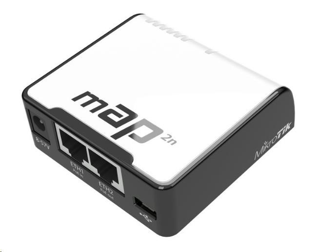 RBmAP2nD je velmi malý acces point (AP) se všemi možnostmi RouterOS. Velkou výhodou tohoto AP je, že zároveň slouží jako PoE pro CPE (například SXT, eth02 až 500mA, výstupní napětí odpovídá vstupnímu). Nechybí ani podpora PoE in (pasivní 10-57V nebo aktivní 802.3af/at), taktéž se zde nachází napájecí jack konektor. Integrovaná WiFi nově podporuje dual-chain, pracuje v pásmu 2.4GHz a podporuje standarty 802.11b/g/n. Dále je k dispozici microUSB konektor pro připojení 3G/4G modemu (microUSB konektor může také sloužit jako zdroj vstupního napětí).