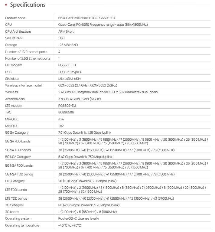 Chateau 5G R17 ax je vysokorychlostní Wi-Fi 6 domácí wifirouter s podporou 5G technologie Chateau je navržen tak, aby sloužil nejrůznějším skupinám uživatelů: od profesionálů v oblasti IT až po běžné domácnosti. Skýtá ultrarychlé prémiové připojení a je navržen tak, aby 5G technologie byla dostupnější než kdykoli předtím. Chateau je nyní vybaven špičkovým modemem 5G Release 17 a plně využívá nejnovější mobilní technologie včetně pokročilých kombinací agregace operátorů. To znamená vyšší rychlost downlinku, vyšší stabilitu signálu a rychlejší odezvu i v oblastech se slabším mobilním pokrytím. TOP bezdrátový výkon Díky čtyřem výkonným vestavěným anténám LTE/5G a dvěma externím dvouřetězcovým anténám Wi-Fi 6 poskytuje Chateau skvělý výkon pro stahování a odesílání dat i v zarušeném prostředí: • Chytrá agregace s podporou širokého regionálního pásma FDD + TDD • Mimořádně silný příjem signálu díky technologii 4x4 MIMO; • Pokrytí Wi-Fi navržené pro domácnosti všech velikostí, včetně vícepodlažních objektů Vaše síť, vaše pravidla (- eSIM nebo microSIM?) Chateau má přímo v sobě integrovanou SIM kartu (eSIM), plně kompatibilní s: • MikroTik Connectivity (předaktivované datové tarify) • eSIM třetích stran (profily eSIM mobilních operátorů) • Více profilů eSIM (snadné přidávání, přepínání nebo ukládání) RouterOS - operační systém jednotek Routerboard Chateau využívá RouterOS v7, operační systém společnosti MikroTik pro průmyslové použití, který používají poskytovatelé internetu a správci sítě po celém světě. Operační systém s jednoduchým uživatelsky přívětivým rozhraním, které se může naučit používat každý. K dispozici též uživatelská aplikace pro iOS/Android pro ještě snadnější instalaci. Bezplatný pokočilý RouterOS umožňuje uživateli celou řadu užitečných funkcí .... Nastavte si bezpečnou síť VPN. Optimalizujte streamování. Omezte šířku pásma. Vytvářejte sítě VLAN. Blokujte weby. Odesílání upozornění SMS při špičkách. Chateau 5G ax R17 je optimální volbou pro uživatele • kteří potřebují rychlý, spolehlivý a bezpečný internet LTE/5G. • mobilní operátory, kteří hledají moderní, jednoduchou a cenově dostupnou správu zařízení TR-069. • domácnosti unavené z laciných wifirouterů s limitovanou funkcionalitou a výkonem. • připravené opustit pomalé DSL nebo nejednotné extendery Wi-Fi. RouterOS kontejnery K dispozici funkce kontejnerů - pro domácí automatizaci, blokování reklam, jednoduchý webhosting, privátní DNS, síťové úložiště, IoT a mnoho dalšího. Vlastnosti Chateau je vybaven všemi pokročilými funkcemi RouterOS, takže získáte řešení podnikové úrovně za cenu spotřebitelské třídy. • využívejte zabezpečenou síť VPN z kanceláře přímo k vám domů • povolte nejrůznější druhy rodičovské kontroly • ponořte se do specifických pravidel brány firewall a hardwarové akcelerace IPsec • nakonfigurujte sítě VLAN, nastavte e-mailová nebo SMS upozornění • můžete automatizovat složitá spouštěcí oznámení (např: "VAROVÁNÍ!" pokud šířka pásma dosáhla hodnoty X po dobu trvání Y!) Technické specifikace: Product code: S53UG+5HaxD2HaxD-TC&RG650E-EU CPU: Quad-Core IPQ-6010 Frequency range - auto (864-1800MHz) CPU Architecture: ARM 64bit Size of RAM: 1 GB Storage: 128 MB NAND Number of 1G Ethernet ports: 4 Number of 2.5G Ethernet ports: 1 LTE modem: RG650E-EU USB: 1x USB 2.0 type A SIM slots: Micro SIM, eSIM Wireless interface model: QCN-5022 (2.4 GHz), QCN-5052 (5GHz) Wireless: 2.4 GHz 802.11b/g/n/ax dual-chain, 5 GHz 802.11a/n/ac/ax dual-chain Antenna gain: 3 dBi (2.4 GHz), 6 dBi (5 GHz) LTE modem: RG650E-EU TAC: 86896506 MIMO DL: 4x4 MIMO UL: 2x2 5G SA Category: 7.01 Gbps Downlink, 1.25 Gbps Uplink 5G SA FDD bands 1 (2100MHz) / 3 (1800MHz) / 5 (850MHz) / 7 (2600MHz) / 8 (900 MHz) / 20 (800 MHz) / 26 (850 MHz) / 28 (700 MHz) / 67 (700 MHz) / 75 (1500 MHz) / 76 (1500 MHz) 5G SA TDD bands 38 (2600MHz) / 40 (2300MHz) / 41 (2500MHz) / 77 (3700 MHz) / 78 (3500 MHz) 5G NSA Category 5.47 Gbps Downlink, 730 Mbps Uplink 5G NSA FDD bands 1 (2100MHz) / 3 (1800MHz) / 5 (850MHz) / 7 (2600MHz) / 8 (900 MHz) / 20 (800 MHz) / 26 (850 MHz) / 28 (700 MHz) / 67 (700 MHz) / 75 (1500 MHz) / 76 (1500 MHz) 5G NSA TDD bands 38 (2600MHz) / 40 (2300MHz) / 41 (2500MHz) / 77 (3700 MHz) / 78 (3500 MHz) LTE Category 20 (2.0 Gbps Downlink, 211 Mbps Uplink) LTE FDD bands 1 (2100MHz) / 2 (1900MHz) / 3 (1800MHz) / 5 (850MHz) / 7 (2600MHz) / 8 (900 MHz) / 20 (800MHz) / 28 (700MHz) / 32 (1500 MHz) LTE TDD bands 38 (2600MHz) / 40 (2300MHz) / 41 (2500MHz) / 42 (3500MHz) / 43 (3700MHz) 3G Category R8 (42.2Mbps Downlink, 5.76Mbps Uplink) 3G bands 1 (2100MHz) / 5 (850MHz) / 8 (900MHz) Operating system: RouterOS v7, License level 4 Operating temperature: -40°C to +70°C Napájení: Number of DC inputs: 1 DC jack input Voltage: 12-28 V Power adapter nominal voltage: 24 V Power adapter nominal current: 1.2 A Max power consumption (without attachments): 16 W Max power consumption: 26 W Upozornění Výrobce Mikrotik neposkytuje záruku na zařízení poškozená přepětím. Zařízení je třeba adekvátně chránit proti indukovanému elektrostatickému přepětí či přepěťovým špičkám na silovém vedení. Pro venkovní instalace používat výhradně stíněnou kabeláž (FTP/SFTP), jednotky korektně uzemnit (užití integrovaného zemnícího členu, ethernetové přepěťové ochrany). Zařízení vždy provozujte s poslední výrobcem publikovanou verzí (výrobcem označenou "Stable") operačního systému RouterOS. Taková verze garantuje nejoptimálnější funčknost, obsahuje opravené chyby z verzí předchozích a výkonová vylepšení. .