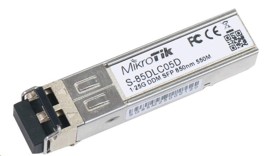 MikroTik S-85DLC05D je 1.25G SFP transceiver s 850nm, dual-LC konektorem. Je určen pro mnohovidová vlákna (MM - multi mode). do 550m (s DDM).