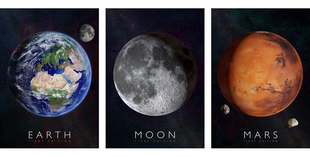 Balení obsahuje 3 plakáty: Země, Měsíc a Mars. Plakáty jsou vytištěny na odolném papíře ve velikosti A1 (594 × 841 mm).