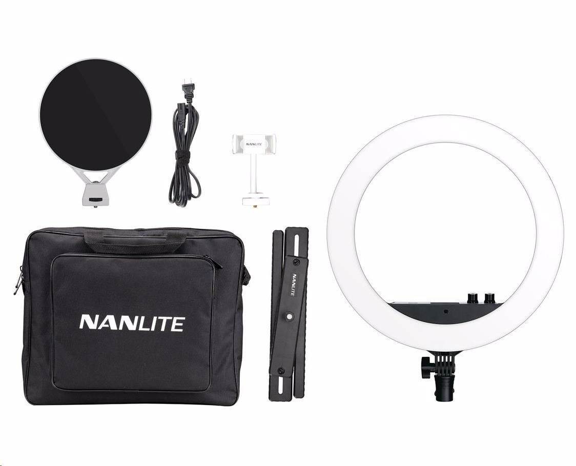 Stmívatelné dvoubarevné LED kruhové světlo Nanlite Halo 14 s napájením pomocí AC adaptéru. Součástí balení je také držák na telefon, make-up zrcátko, přepravní pouzdro a světelný stativ.
