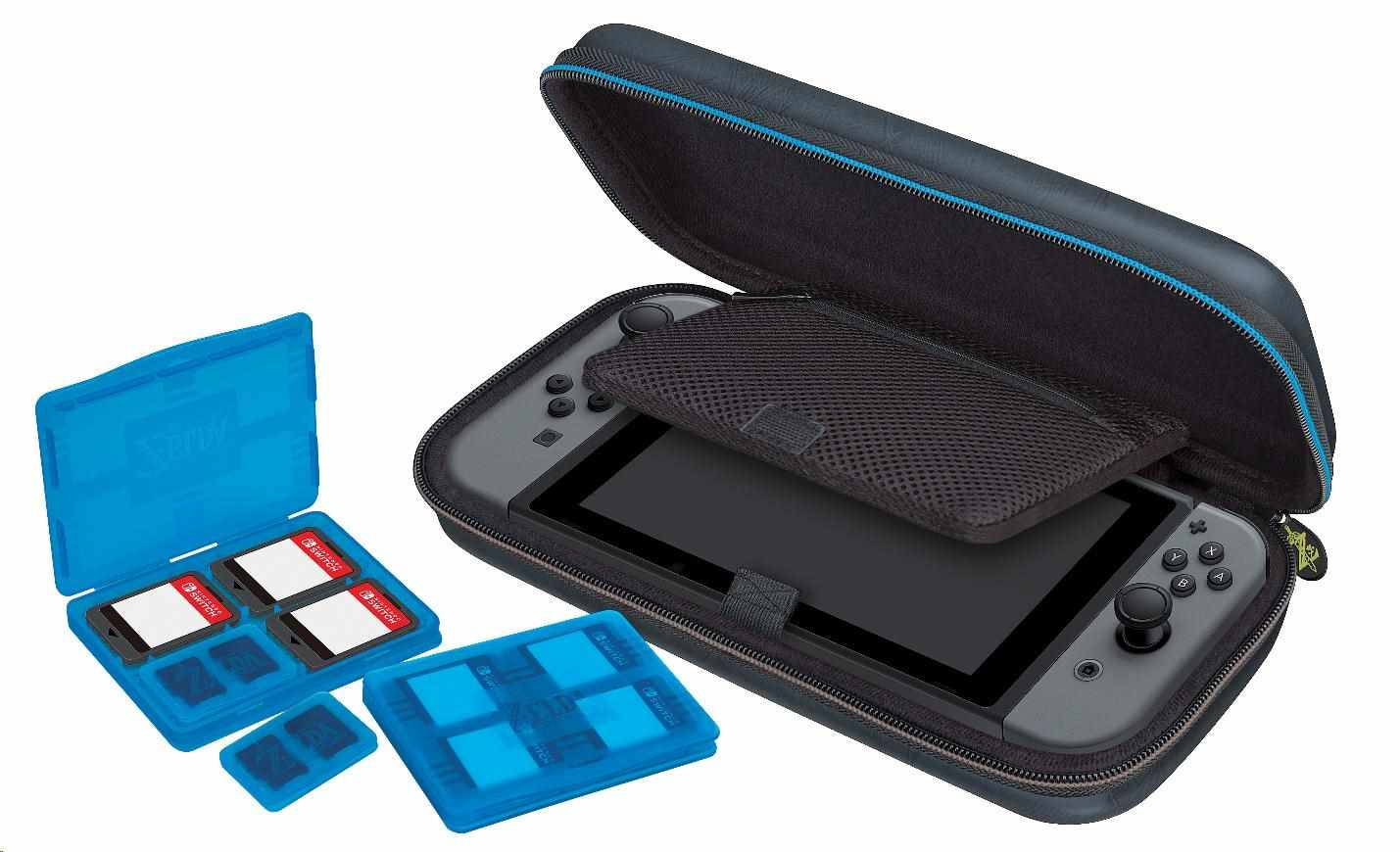 Balení rovněž obsahuje dvě plastová pouzdra na herní karty s logem Legend of Zelda™: Breath of the Wild, z nichž do každého se vejdou čtyři herní karty, a také dvě plastová pouzdra na microSD karty s logem Legend of Zelda™: Breath of the Wild, přičemž do každého z těchto menších pouzder se vejdou dvě microSD karty a každé z těchto pouzder se vejde do libovolné pozice ve větším pouzdru na herní karty.