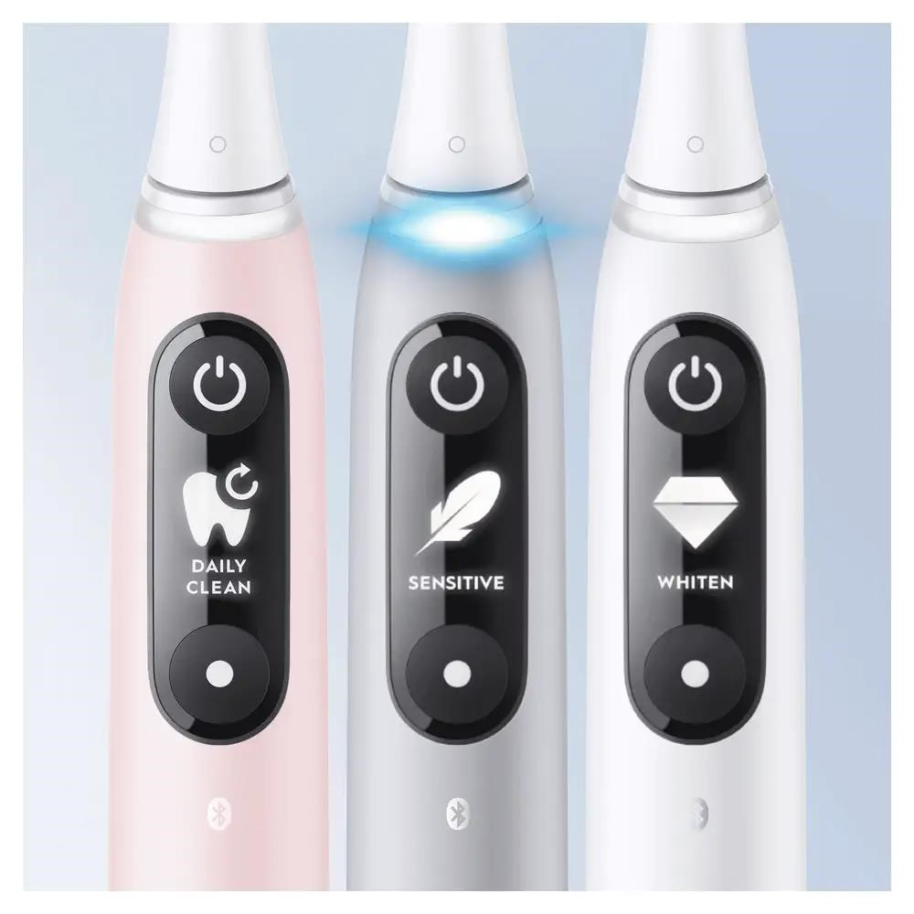 Kartáček nabízí 5 chytrých režimů, se kterými si můžete nastavit čištění podle individuálních potřeb: pro každodenní čištění, jemný, péče o dásně, intenzivní čištění a bělicí. Interaktivní displej OLED ukazuje důležité informace, včetně režimů čištění a připomínky výměny kartáčkové hlavy, pozdravu, když ho zapnete, a úsměvu za dobře odvedenou práci. Prémiové cestovní pouzdro zajistí hygienu kartáčku na cestách a stane se elegantním doplňkem každé hygienické tašky. Zažijte to nejdůkladnější, nejjemnější a nejtišší čištění zubů od značky Oral-B!