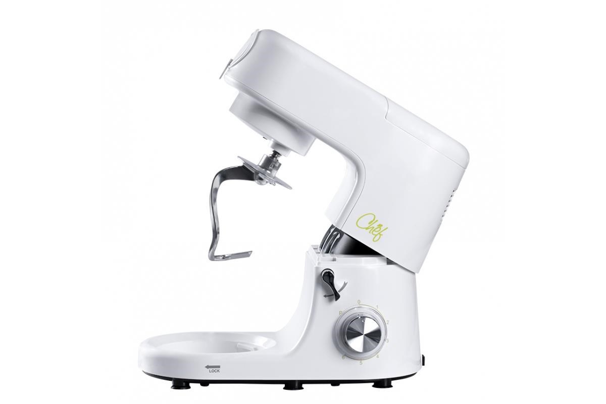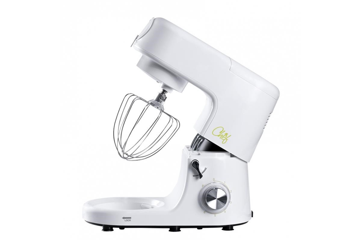 Vysoce kvalitní kuchyňský robot Chef 1 je úžasný pomocník, který za vás odvede těžkou práci při vaření a pečení. Díky němu bude vaše kuchyně ušetřena namáhavé práce při vaření, pečení a míchání. Vypadá jako šéfkuchař – stylová bílá barva s černými a nerezovými akcenty působí jako nezaměnitelný profesionál, který najde své místo v každé kuchyni bez ohledu na styl vybavení, ale jeho silné stránky nejsou jen vzhled, ale také schopnosti. 6 rychlostí a pulzní režim zvládnou vše: v 7litrové nerezové míse uhnětete a vyšleháte perfektní těsto a krémové dorty, kovový mlýnek na maso snadno namele maso na poctivý domácí hamburger. Na třístupňovém struhadle můžete krájet a strouhat zeleninu a ovoce do salátů, ale také do sladkých a slaných dortů. 1,5litrová skleněná mísící mísa je ideální pro přípravu polévek, omáček a zdravých smoothie. S jeho pomocí snadno vykouzlíte sladké cukrovinky. Snadno se rozebírá na menší části, které lze snadno umýt pod tekoucí vodou. Chef je vybaven gumovými přísavkami pro stabilní uchycení na pracovní ploše.