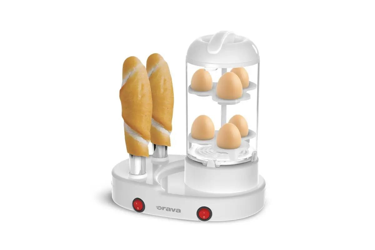 Tradiční snídaňové kombo? Párky a chutná vajíčka na tvrdo nyní připravíte v jednom spotřebiči. Stroj na přípravu hotdogů Orava HM-04 se dvěma nástrčnými trny a varnou nádobou z nerezavějící oceli dokáže v horké páře připravit až 6 párků a s použitím speciálního nástavce i 6 vajíček na tvrdo.