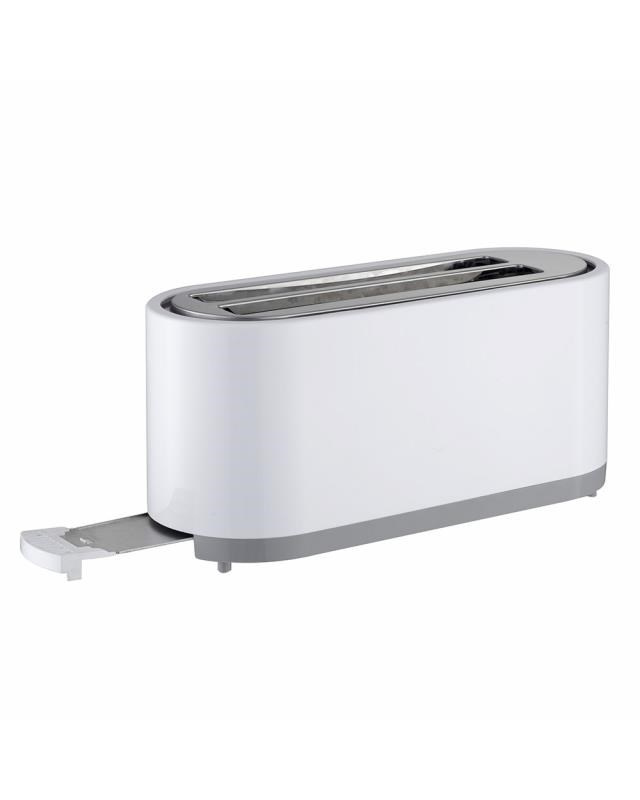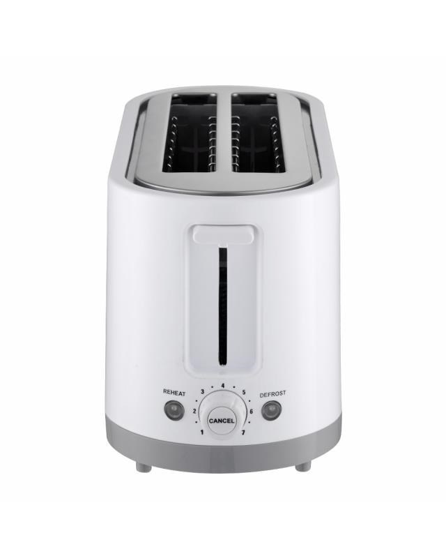 Topinkovač - na 4 topinky, regulace opékání, rozmrazování, tlačítko okamžitého ukončení, automatické vypnutí, světelná signalizace a rozpékač, součástí vyjímatelná miska na drobky a nástavec na rozpékání pečiva, příkon 1400 W, materiál plast, barva bílá.