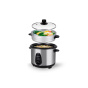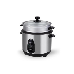 "Multifunkční hrnec. Jednoduché ovládání a rychlé vaření. Plně automatický provoz. Objem 1,5 l (pro přípravu 450 g rýže). Vhodný pro přípravu všech druhů rýže včetně rýže na sushi. Pařák pro šetrné a zdravé vaření ryb, zeleniny, případně pro ohřev dalších potravin. Světelná signalizace provozu a udržování teploty. Funkce Keep Warm uchová rýži teplou a čerstvou až 6 hodin. Jednoduché čištění, vyjímatelná vnitřní nádoba s nepřilnavým povrchem. Skleněná poklice s otvorem pro únik přebytečné páry. Dodávané příslušenství: špachtle na rýži, odměrka na rýži a vodu. Praktické rukojeti na obou stranách Protiskluzové nožičky. Napájení: 220 – 240 V~ 50 – 60 Hz, 500 W".