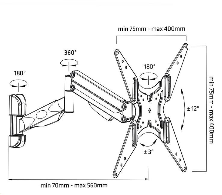 Otočný, sklopný, délkově a výškově stavitelný držák Tv Fiber Mounts AX784 Plně nastavitelný, kvalitní držák na Tv 32-60"s hmotností do 22kg Kvalitní, plně nastavitelný, designový držák na LCD, LED, OLED, 3D, Full HD televize s hmotností až 22kg. Optimální úhlopříčka televizoru 32-60". Držák je vhodný pro zavěšení televize na zeď, do výklenku, na pilíř nebo sloupek, stejně tak je držák vhodný i pro umístění televizoru do rohů místností. Plná nastavitelnost Vám umožní snadno polohovat televizi přesně dle Vašich potřeb a požadavků. Držák Tv Vás mile potěší nejen svou kvalitou ale i velmi pěkným designem a snadnou polohovatelností. Dodáváme včetně instalačního materiálu, barevné provedení černé. Otočný, sklopný, délkově a výškově nastavitelný držák na LCD LED OLED 3D Smart televize i monitory s hmotností do 22kg. Držák je vhodný pro zavěšení televize na zeď nebo do rohu místnosti, do výklenku nebo na pilíř, sloupek. Držák Tv Fiber Mounts AX784 Technické údaje: pro televizory s hmotností 9kg až 22kg na televize a monitory s úhlopříčkou 32-60" podpora VESA 75x75 až 400x400 otáčení do stran +/- 90° náklon +/- 12° úprava délky od zdi 70mm až 560mm úprava roviny obrazovky +/- 3° úchytky pro vedení kabeláže velmi pěkný vzhled snadné nastavení Tv do požadované polohy výborná kvalita barevné provedení černé záruka 2 roky Držák Fiber Mounts AX784 podporuje VESA standardy (VESA normy): VESA 75x75 VESA 100x100 VESA 200x100 VESA 200x200 VESA 300x300 VESA 400x200 VESA 400x400.