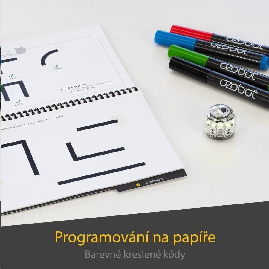 Jak už bylo zmíněno, děti i dospělí mohou kódovat Ozobot Evo dvěma způsoby. Pro začátek vám k programování stačí fixy a papír. Vaším úkolem bude nakreslit pro robota vodící černé linie, které by mohl sledovat. Na ně umístíte barevné kódy složené ze sekvence červených, zelených a modrých čtverečků. Ty robotovi určí směr, rychlost, spustí počítadlo nebo časovač, popřípadě mu dovolí předvést cool pohyby. Ozokódů, kterými dráhu můžete okořenit, existuje spoustu. A nebojte – nemusíte se je učit zpaměti. Jejich přehled můžete mít vy i děti neustále po ruce. Věnujete se malým dětem, pro které by i kreslení drah s barevnými kódy mohlo být obtížné? Chcete ušetřit množství spotřebovaného papíru? Základní startovací kit můžete rozšířit o sadu magnetů, které je perfektně zastoupí.Další možností je vizuální programování v aplikaci či online blokovém editoru Ozobot Blockly nebo novejším Ozobot Editoru. V tomto intuitivním prostředí mohou hlavně starší žáci řadit za sebou jednotlivé bloky s pohyby, zvuky, světelnými efekty, smyčkami a časovači a vytvářet přitom jejich unikátní kombinace. Složitost jednotlivých úkonů je přehledně rozdělena do celkem 5 úrovní, aby si každý malý programátor mohl vybrat tu svou. Vaše originální programy pak nahrajete přímo do bota a necháte ho převést je v akci. Nově lze celé prostředí editoru přepnout do jazyka Python a naučit studenty používat i tento programovací jazyk. Ať už zvolíte jakoukoliv metodu, procvičíte si své dovednosti tvořit posloupnosti, příkazy, pracovat s logikou a posilovat schopnost řešit problémy.
