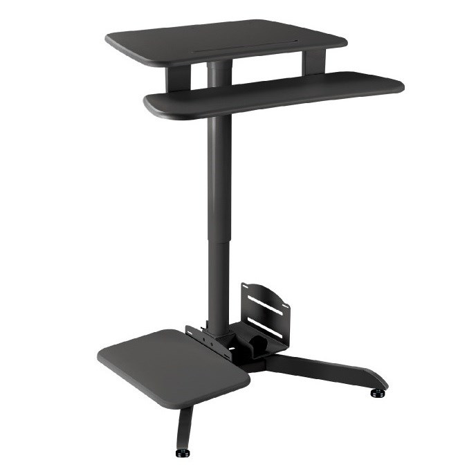PC pracovní stanice Fiber Mounts M8C48 Pracovní stanice na PC, monitor, tiskárnu, klávesnici a myš, nastavitelná výška pro změnu pozice pro práci vsedě nebo vestoje 70-109cm, nosnost 30kg Moderní pracovní stanice s nastavitelnou výškou pro práci v sedě nebo vestoje. Díky unikátnímu systému plynové pružiny velmi snadno a rychle upravíte výšku a můžete pracovat buď vsedě nebo vestoje. Pracovní stanice obsahuje dolní držák na PC, polici na tiskárnu nebo jakékoliv příslušenství, horní pracovní desku na monitor s možností použití držáků na monitory, a polici na klávesnici a myš. Pracovní stanice je vynikající kvality, spolehlivá konstrukce zaručuje bezpečnost, stabilitu a dlouhou životnost (10 i více let). Barevné provedení černé, záruka 3 roky. Pracovní stanice na PC, tiskárnu, klávesnici, myš a pracovní deskou na monitor. Výškové polohování pro práci v sedě nebo ve stoje. Kancelářská pracovní stanice Fiber Mounts M8C48 Technické údaje: nosnost 30kg výškové polohování pro práci v sedě nebo vestoje 70-109cm snadné a rychlé nastavení výšky díky plynové pružině deska na monitor, možnost použití stolních držáků na monitory polička na klávesnici a myš, šířka 717mm spodní police na příslušenství - tiskárnu apod. univerzální držák pro uchycení PC toweru stabilní podstava, stojky vynikající, velmi pevná konstrukce barevné provedení černé záruka 3 roky Dolní polička na příslušenství, např. tiskárnu a univerzální držák na PC tower na pracovní stanici Fiber Mounts M8C48 Pracovní stanice Fiber Mounts M8C48 mají velmi široké spektrum využití, od kanceláří a firem, konferenčních místností až po domácnosti, kde není místa nazbyt. Unikátní konstrukce s plynovou pružinou umožňuje kdykoliv velmi rychle změnit pracovní výšku pro práci v sedě nebo vestoje. Horní deska na monitor je vhodná i pro použití stolních držáků na monitory - monitor můžete mít volně položený na podstavci nebo uchycený na držáku..