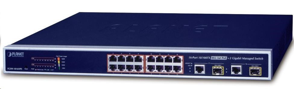Planet FGSW-1816HPS PoE switch 16x 100-TX, 2x 1000-T/SFP, PoE 802.3at