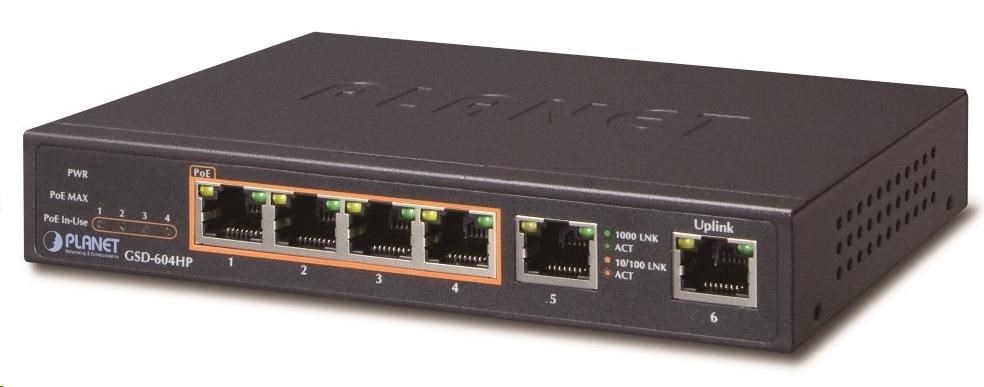 Planet GSD-604HP Switch, 55W, ext.zdroj, kov, fanless