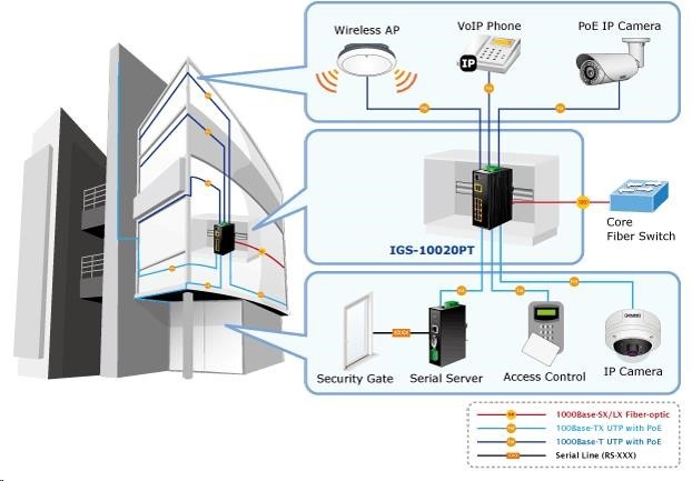 Planet IGS-10020PT PoE switch 8x 1000Base-T, 2x SFP, 802.3af 130W, IP30, -40 až 75°C, SNMP, IGMPv3, IPv6 Inteligentní přepínače pro průmyslový Ethernet jsou určeny do náročných provozních podmínek s velkým rozsahem pracovních teplot, nejistým napájením a častými otřesy. Zároveň poskytují vynikající možnosti vícenásobných propojení pro dosažení robustnosti propojení systémů s velmi nízkou dobou zotavení. IGS-10020PT je vybaven pro redundanci kromě dobře známé metody Spanning Tree (jejíž doba zotavení je v řádu sekund) především specializovanou funkcí "Redundant ring" která má dobu zotavení a nalezení nové cesty do 300ms. Jako PoE přepínač umožňuje přímo napájet až 8 koncových zařízení dle normy IEEE 802.3af, je tak ideálním prvkem pro aplikace se sníženou možností napajení. Přepínače řady IGS se snadno instalují na standardní DIN lištu nebo přímo na zeď a umožňují nasazení dobře známé Ethernetové technologie i v průmyslovém prostředí. Stejně tak jsou vhodné pro instalace do venkovně umístěných skříní s velkým kolísáním pracovních teplot (typicky bezdrátové a MAN ISP aplikace). Vlastnosti: - 8 portů 1000Base-T, Switching, Full Duplex (1000/2000 Mbps), Auto-Negotiation (10/100/1000 Mbps), automatická detekce přímý/křížený kabel na každém portu - na všechny implementace PoE IEEE 802.3af injektory se zatížitelností 15,4W/port, celkově až 130W - 2 porty SFP pro instalaci modulů 1000Base-SX/LX/BX nebo 100Base-FX - propustnost: sběrnice 20Gbps, provozně: 14,8Mp/s (64B) - podpora Jumbo Frame do 9kB, 8k MAC adres, buffer 4Mbity - 255 VLAN IEEE 802.1Q sítí, MAC nebo protocol based VLAN, VoIP VLAN - agregace linek "port trunking" IEEE 802.3ad LACP - IGMP v1,v2,v3 až do 256 multicast skupin, IGMP querier mode - 8-úrovní QoS prioritizace provozu dle portu, DSCP/ToS, 802.1p nebo 802.1Q značky - podpora Spanning Tree IEEE 802.1d, Rapid Spanning Tree IEEE 802.1w - IP/MAC ACL (access control list) do 123 pravidel, MAC/IP binding - DHCP snooping - port shaper - administrace Web/SNMPv3 s podporou zabezpečeného přenosu SSH/SSL - podpora IPv4/IPv6 - PoE scheduler pro možnost zapínání/vypínaní napájení podle časového plánu - pole LED indikátorů pro diagnostiku provozu - instalace na DIN lištu, montážní díl součástí - instalace na zeď, montážní díl součástí - krytí IP30 - napájení: 48V DC redundantní, připojení možné ze dvou různých zdrojů (nejsou součástí balení); vlastní příkon do 30W - ochrana proti přepólování, připojení napájení na svorkovnici, umístění na spodním panelu (nepřekáží při montáži na zeď) - přepěťová ochrana napájení do 6kV proti napěťovým špičkám (EFT) - přepěťová ochrana LAN portů do 6kV proti elektrostatickému náboji (ESD) - spínací poplachové relé (24V/1A) při výpadku primárního napájení - zařízení je odolné proti pádu (IEC-60068-2-32) z výšky 75cm na všechny dopadové části - zařízení je odolné proti vibracím (IEC-60068-2-6) 10-500-10Hz, 4x g, 0,5oct/min - zařízení je odolné proti přetížení krátkodobému zrychlení 50g, dlouhodobému 4g, (IEC-60068-2-27) - EMI/EMS, elektromagnetická kompatibilita a slučitelnost dle CE EN-6100-4-2,3,4,5,6 - elektrická bezpečnost dle CE EN-60950 - pracovní teplota -40 až 75°C, vlhkost do 95% - hmotnost: 1684g - rozměry: 152 x 107x 72 mm.