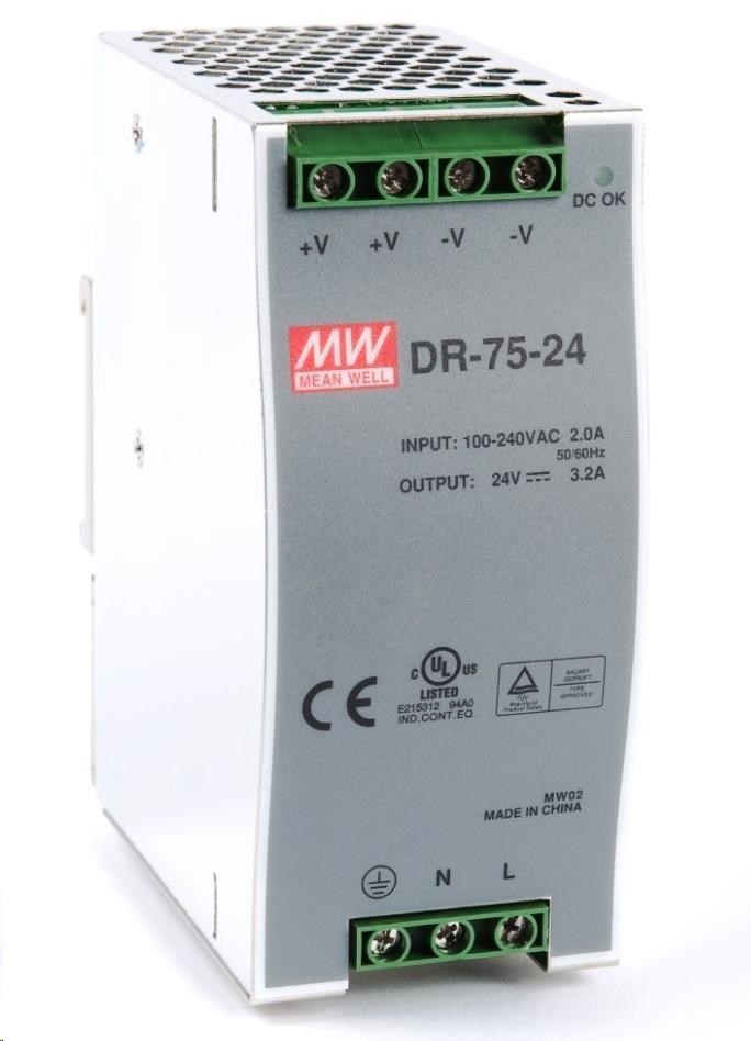 Napájecí zdroj pro instalaci na DIN lištu. Výstupní napětí 24V DC, zatížitelnost 75W. Provozní teplota -10 až 60°C. ZÁKLADNÍ SPECIFIKACE Výstupní obvod: Výstupní napětí: 24V DC Výstupní proud: 3,2 A Celkový výstupní výkon: 75 W Ochranné prvky: zkrat, přetížení, přepětí a přehřátí Typ připojení: šroubová svorkovnice Vstupní obvod: Vstupní napětí: 100-240V AC, 50/60Hz, 2.0A/ 120-370V DC Typ připojení: šroubová svorkovnice Mechanické vlastnosti: Materiál: kovová skříň, perforovaná Rozměry: 125 x 100 x 55 mm Hmotnost: 600 g Montáž: DIN lišta.