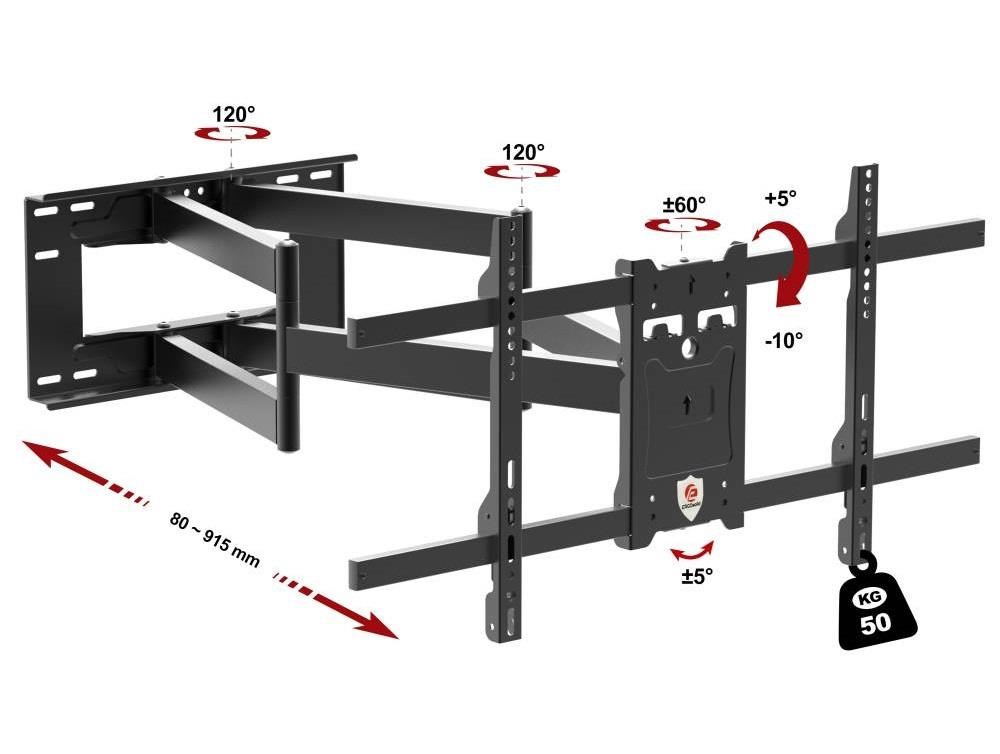 Poctivý držák na televize Ergosolid ONYX-30 Kvalitní nástěnný držák na Tv 43-90", výsuvný 80-915mm, otočný +/-65°, náklon +5°/-10°, korekce roviny +/-5°, VESA 200x100 až 800x400, nosnost 50kg Nástěnný držák poctivé konstrukce pro spolehlivé zavěšení všech typů a značek televizí. Držák Vám umožní televizi nastavit od zdi do vdáleností v rozmezí 80mm až 915mm. Otáčení do stran bude možné minimálně o 60° na každou stranu, náklon je možný v rozmezí +5°až -10°. Pro usnadnění instalace má držák možnost korekce roviny obrazovky až o 5° na každou stranu. Celá konstrukce držáku je vyrobena z poctivé ocely a ani při maximálním vysunutí a maximálním zatížení nevznikají žádné vůle a nedochází k prověšení ramen. Instalační nástěnná plocha s rozměry 455x255mm je dostatečně velká pro spolehlivé uchycení na zeď a výborné rozložení celkové hmotnosti na větší plochu. Držák podporuje VESA standardy 200x100 až 800x400 a zavěsit na něj můžete televize s hmotností až 50kg. Barevné provedení je černé. Na držák poskytujeme záruku 5 let. Nástěnný extra dlouhý výsuvný držák poctivé konstrukce na televize 43-90" Ergosolid ONYX-30 Technické údaje: nosnost 50kg podporuje VESA 200x100 až 800x400 ideální na televize s úhlopříčkou 43" až 90" nastavitelná vzdálenost od zdi 80mm až 915mm otáčení na obě strany až +/- 60° naklápění dolů až o 10° nebo nahoru až o 5° korekce roviny obrazovky až +/- 5° instalační plocha o rozměrech 455x255mm vynikající kvalita ocelová silnostěnná konstrukce instalační materiál je součástí balení barevné provedení černé záruka 5 let Kvalitní konstrukce a opravdu rozsáhlá možnost polohování jsou předností televizního držáku Ergosolid ONYX-30 Tv držák Ergosolid ONYX-30 podporuje tyto VESA standardy: VESA 200x100 VESA 200x200 VESA 300x200 a 200x300 VESA 300x300 VESA 400x200 a 200x400 VESA 400x300 a 300x400 VESA 400x400 VESA 600x400 VESA 800x400 Na televizní držák Ergosolid ONYX-30 můžete zavěsit všechny typy, značky a velikosti televizorů, které mají hmotnost maximálně 50kg a které podporují kterýkoliv z výše uvedených VESA standardů. Univerzální držák na LCD LED plazma OLED QLED televize 43-90" Ergosolid ONYX-30 V balení naleznete tento instalační materiál: šrouby M4x14mm 4ks šrouby M6x14mm 4ks šrouby M6x30mm 4ks šrouby M8x20mm 4ks šrouby M8x45mm 4ks malé distační válečky 4ks velké distanční válečky 4ks univerzální podložky 4ks podložky na šrouby 5ks vruty do hmoždinek 8x60mm 5ks hmoždinky O10x50mm 5ks stahovací pásky na suchý zip 2ks (fixace kabeláže na držáku) Televizní držák poctivé konstrukce a vynikající kvality Ergosolid ONYX-30 dodáváme včetně instalačního materiálu Držáky Tv Ergosolid ONYX-30 poskytují velkou variabilitu polohování obrazovky, vynikající zpracování a naprosto bezpečné zavěšení televizoru za dostupnou cenu. Tyto držáky vydrží opravdu mnoho let bez nutnosti jakýchkoliv oprav a díky univerzálnosti jsou vhodné i v případě zakoupení nové televize. Stanou se součástí Vašeho domova..