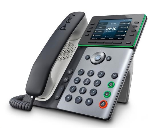 | Audio | Poly HD Voice; Technologie Poly Acoustic Clarity zajišťuje plně duplexní hovory a potlačuje akustickou ozvěnu i okolní šum; Technologie Poly Acoustic Fence potlačuje okolní hluk při použití sluchátka nebo kabelové náhlavní soupravy; Technologie Poly NoiseBlockAI odstraňuje většinu okolního hluku při používání konferenčního reproduktoru; Aplikace Poly Computer Audio Connector nainstalovaná v počítači (pouze Windows) umožňuje vybrat telefon pro zvukový vstup a výstup počítače a použít s počítačovými aplikacemi sluchátka, volitelné náhlavní soupravy a handsfree hlasitého odposlechu; Širokopásmový zvuk TIA-920, v souladu s typem 1 (plně duplexní IEEE 1329); Individuální nastavení hlasitosti s vizuální zpětnou vazbou pro každou zvukovou cestu; Detekce hlasové aktivity; Komfortní tvorba hluku; Generování tónů DTMF (RFC 2833 a v pásmu); Přenos zvukových paketů s nízkým zpožděním; Adaptivní paměti pro vyrovnání zpoždění |