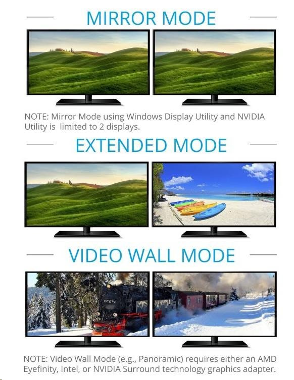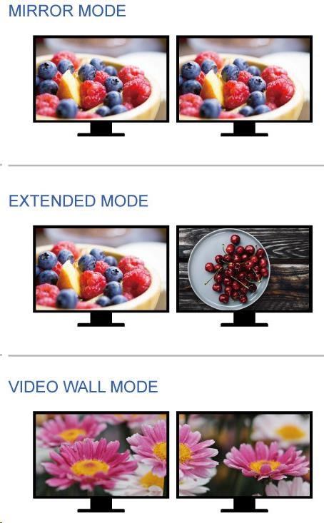 - Adaptér MST umožňuje použití tří módů: 1.Přenos dvou různých obrazů na dva monitory 2.Rozšíření jednoho obrazu na dvě obrazovky 3.Zobrazení dvou stejných obrazů na dvou monitorech