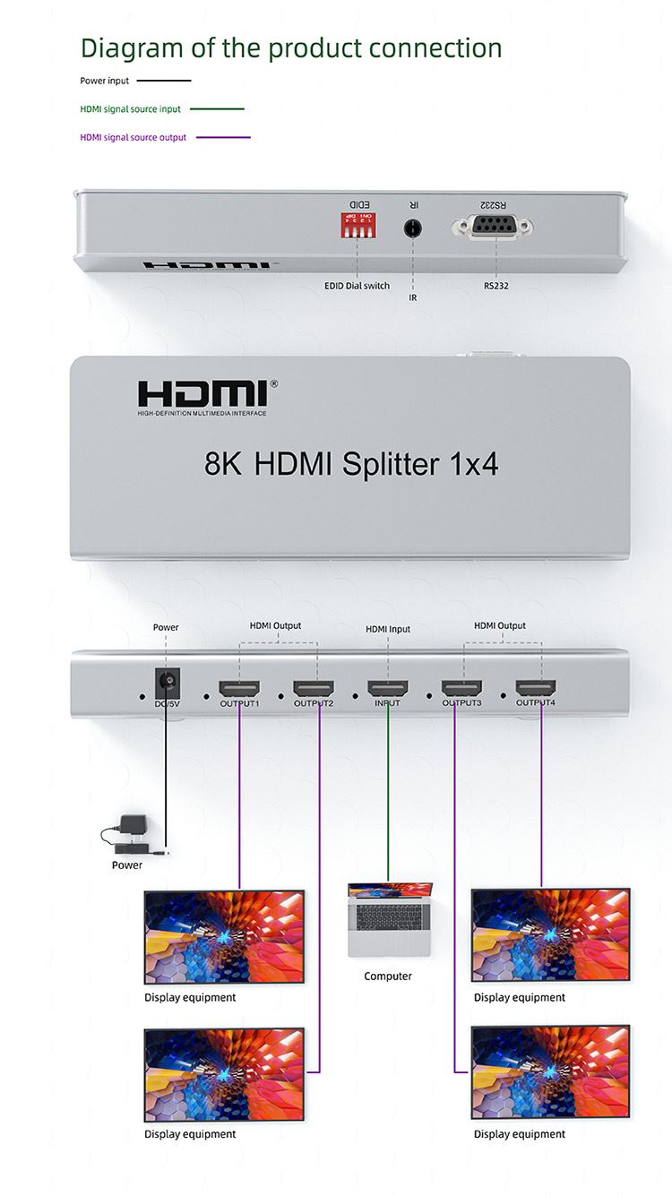 Můžete připojit až čtyři HDMI obrazovky k jednomu HDMI zdroji signálu jako je PC, notebook, DVD, set top box, atd.