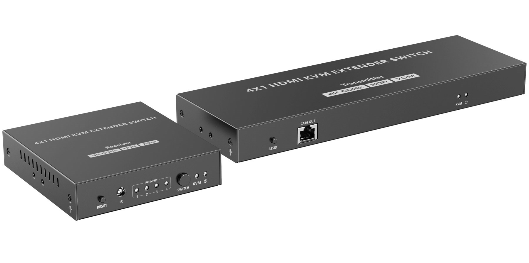 - Komplet se sestává z KVM přepínače (transmitter) a receiveru