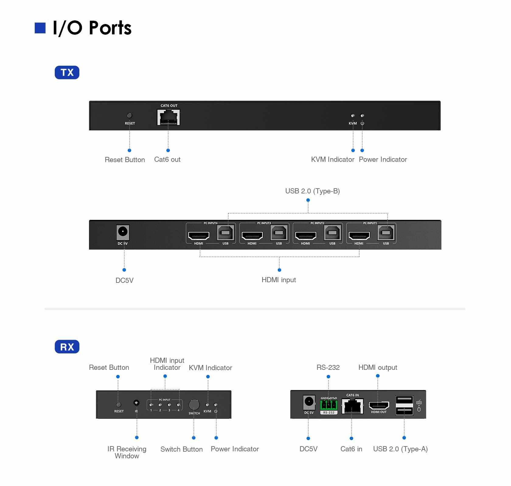 - Výběr serveru /PC pomocí tlačítka, dálkovým ovladačem nebo pomocí RS232