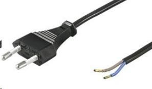Flexo napájecí kabel v černém provedení pro montáž do zařízení. Dvoužilový kabel je zakončený standardní přístrojovou dvoukolíkovou zástrčkou a na druhém konci volné dva vodiče. Parametry a specifikace: První konektor: plochý euro konektor se dvěma kolíky Druhý konec: volné dva vodiče Průřez vodiče: H03VVH2-F2G 2x 0.75 mm2 Izolace: PVC Napětí max.:250V Proudové zatížení: max 2,5A Barevné provedení:Černé Délka kabelu: 2m Počet kusů v kartonu: 200 ks.