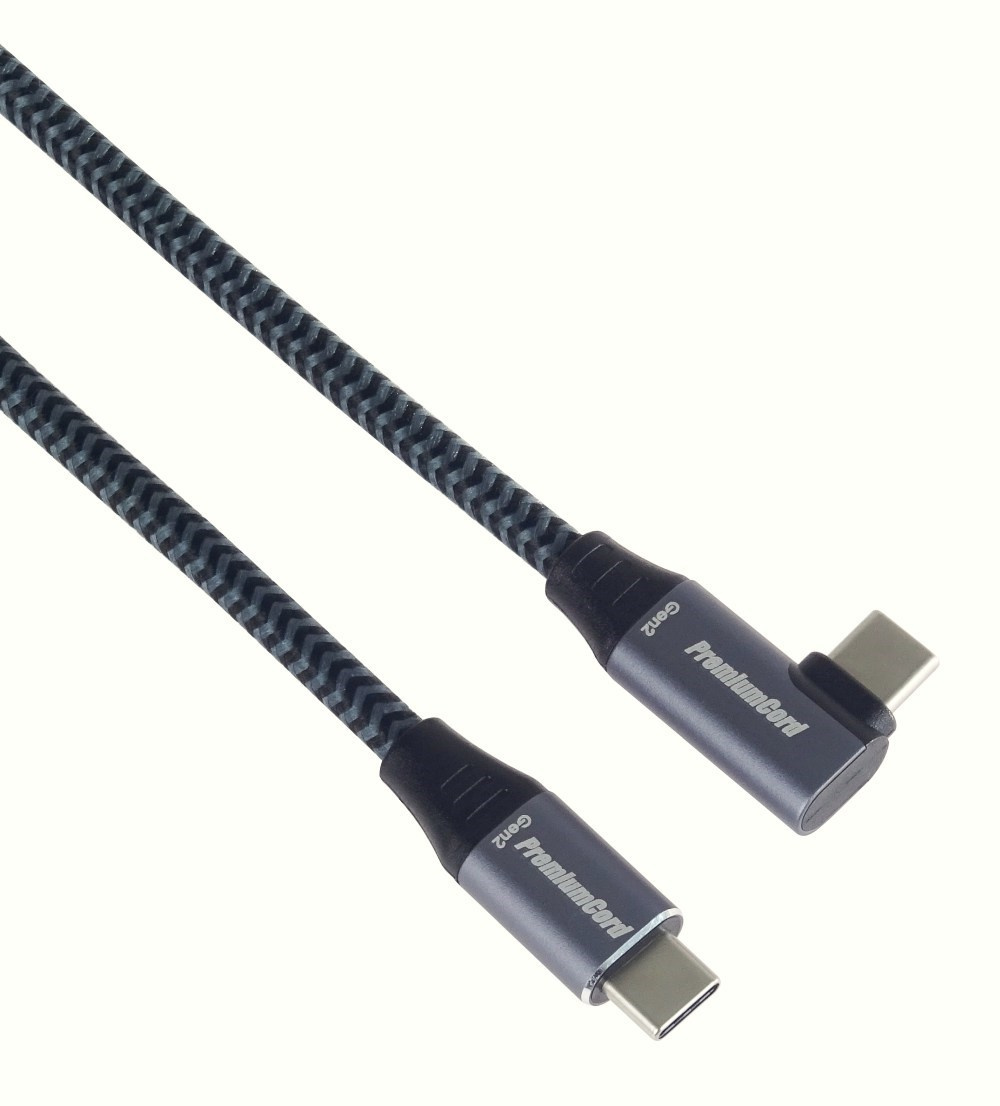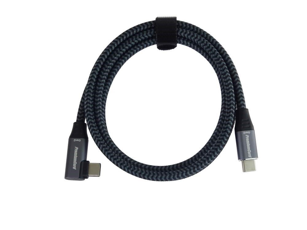 PremiumCord USB-C zahnutý 90° kabel ( USB 3.2 GEN 2x2, 5A, 100W, 20Gbit/s ) hliníkové krytky konektorů, bavlněný oplet, 3m