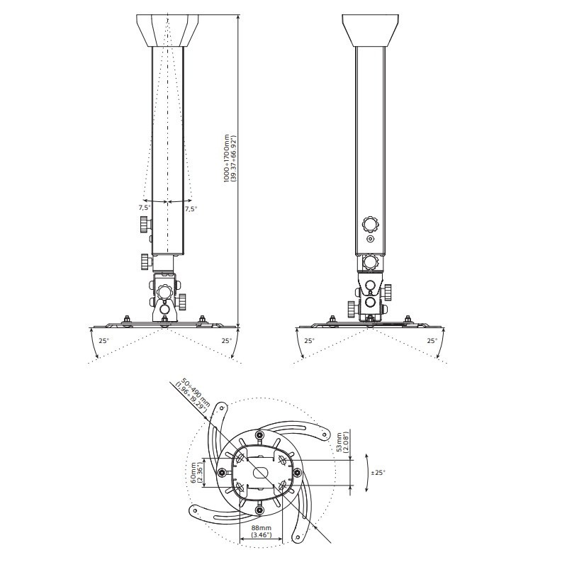 Profesionální designový stropní držák na projektor EDBAK PMV300 Stropní držák pro zavěšení projektoru s hmotností do 15kg, nejvyšší kvalita, design, nastavitelnost 100-170cm Ne vždy je možné použít obyčejný stropní držák na projektory, někdy je nutné použít držáky nejvyšší kvality a krásného designu. My Vám takové držáky na projektory nabízíme. Ucelená řada profesionálních stropních držáků na projektory v nadherném designovém provedení. Držáky jsou plně nastavitelné, vhodné pro 99% dostupných projektorů a dataprojektorů. Barevné provedení černé nebo bílé. Záruka 5 let. Pokud Vám záleží na designu stejně jako na kvalitě, jste na správné stránce. Profesionální stropní držák projektoru s nastavením délky, otočný a sklopný, nejvyšší kvalita Edbak PMV300Délkově nastavitelný stropní držák na projektor Edbak PMV300 Technické údaje: nosnost 15kg univerzální držák pro uchycení 99% dostupných projektorů na projektory se 3 nebo 4 otvory pro uchycení rozteč otvorů pro uchycení v rozmezí 50-490mm délkové nastavení 1000mm až 1700mm otáčení do stran +/- 360° náklon do stran +/- 25° náklon nahoru a dole +/- 25° korekce roviny obrazu korekce nerovnosti stropu +/- 7,5° zajištění v požadované pozici systém pro skryté vedení kabeláže nejvyšší kvalita - profesionální provedení nádherný design bílé nebo černé provedení záruka 5 let Profesionální stropní držáky Edbak PMV jsou délkově nastavitelné, otočné a sklopné, nejvyšší kvalita a krásný design Na stropní držák s nastavením délky 100-170cm EDBAK PMV300 je možné uchytit všechny projektory, které mají 3 nebo 4 otvory se závitem s roztečí 50mm až 490mm. Díky nejvyšší kvalitě a profesionálnímu provedení jsou držáky EDBAK řady PMV vhodné opravdu kamkoliv..