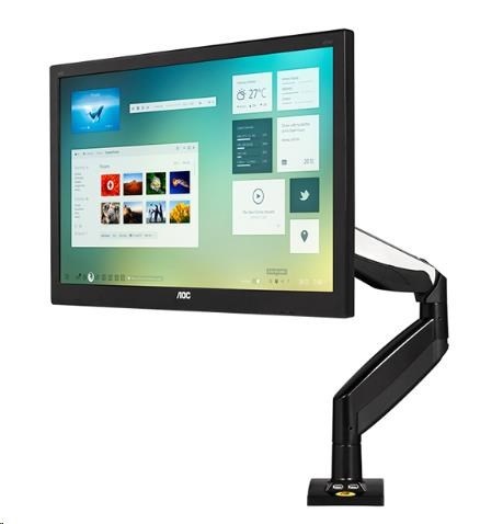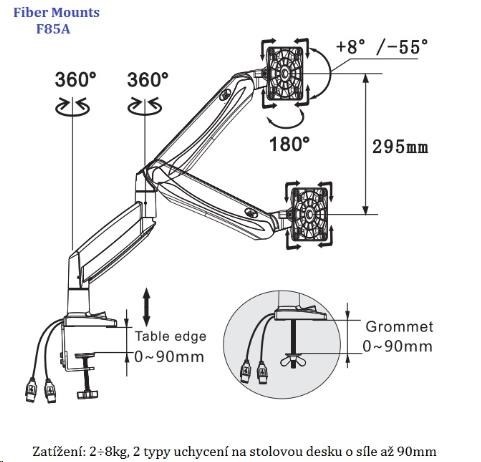 Profesionální kancelářský držák LCD monitoru Fiber Mounts F85A Kancelářský držák na PC monitory 19÷32", nastavení výšky, otáčení, náklon, rotace, korekce roviny, 2 typy uchycení na stolovou desku, USB konektory, systém vedení kabeláže Profesionální stolní držák pro uchycení a polohování PC Lcd monitorů s úhlopříčkou 19 až 32 palců. Držák Vám umožní 3D polohování obrazovky monitoru: otáčení do stran, náklon, nastavení vzdálenosti od stolního uchycení, výškovou polohovatelnost, rotaci monitoru. Držák je osazen USB konektory a má systém pro vedení kabeláže. V balení naleznete 2 typy uchycení na stolovou desku o průměru až 90mm: na kraj stolu nebo do prostoru stolu. Držák podporuje VESA standardy 75x75 a 100x100, v případě potřeby je možné dokoupit rozšíření na 200x100 nebo i 200x200. Zavěsit můžete veškeré monitory a televizory s hmotností 2 až 8kg. Výškovou polohovatelnost zajišťuje plynový píst s nastavitelnou tuhostí - snadná regulace. Profesionální kvalita a krásný design držáku Fiber Mounts F85A umožní použití ve firmách, kancelářích, pracovnách, ale i domácnostech a dětských pokojích. Technické údaje: zatížení 2÷8kg podporuje VESA standardy 75x75 a 100x100 možnost rozšíření VESA na 200x100 nebo 200x200 doporučujeme na monitory a televizory s úhlopříčkou 19 až 32" otáčení do stran +/-90° náklon: nahoru +55°, dolů -8° celková výška 500mm výšková polohovatelnost v rozmezí 295mm maximální vzdálenost od stolního uchycení 572mm funkce PIVOT - rotace monitoru, nastavení horozontální nebo vertikální polohy monitoru korekce roviny monitoru integrované USB konektory součástí balení 2 typy uchycení na stolovou desku: na kraj stolu nebo do prostoru profesionální kvalita snadná nastavitelnost krásný design záruka 2 roky Kancelářský držák na LCD monitory Fiber Mounts F85A podporuje VESA standardy: VESA 75x75 VESA 100x100 možnost dokoupit rozšíření VESA 200x100 možnost dokoupit rozšíření VESA 200x200.