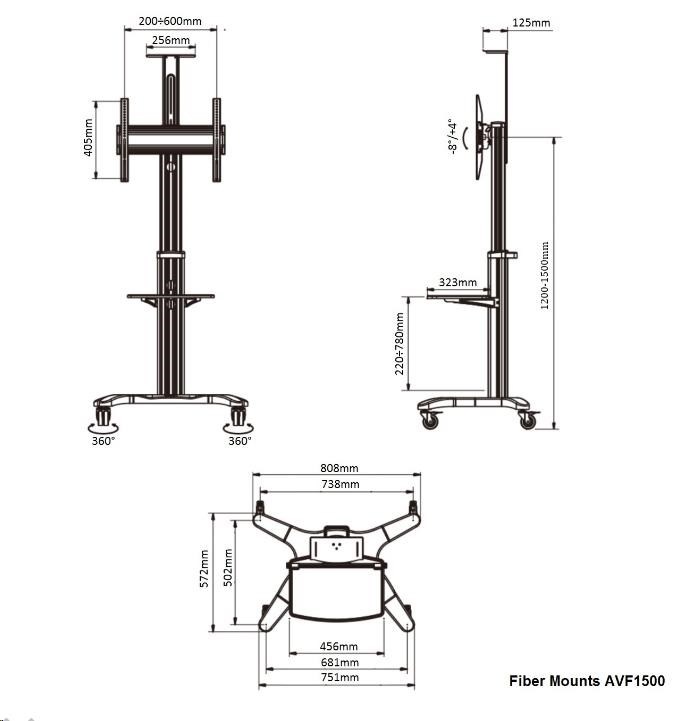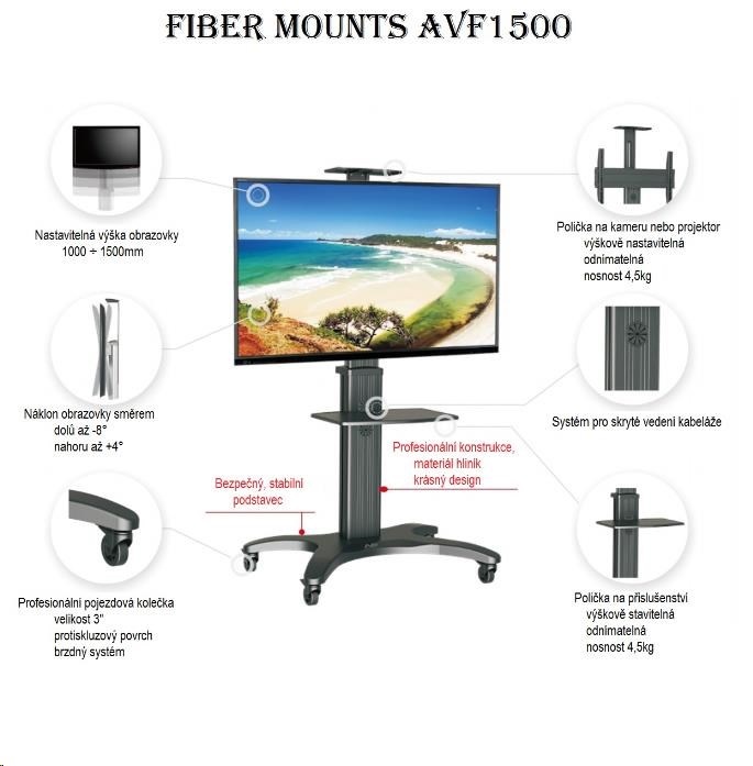 Technické údaje: •maximální zatížení 36,4kg •podporuje VESA standarty 200x100 až 600x400 •na Tv 32" až 60" •min. výška stojanu 1200mm •max. výška stojanu 1500mm •náklon obrazovky +4° až -8° •police na příslušenství - součást balení •police na kameru - součást balení •profesionální konstrukce - top kvalita •pojezdová kolečka s brzdou •dokonalá stabilita •materiál hliník •barevné provedení černé •záruka 5 let Televizní stojan AVF1500 podporuje VESA standardy: •VESA 200x100 •VESA 200x200 •VESA 300x200 •VESA 300x300 •VESA 400x200 •VESA 400x300 •VESA 400x400 •VESA 600x400.