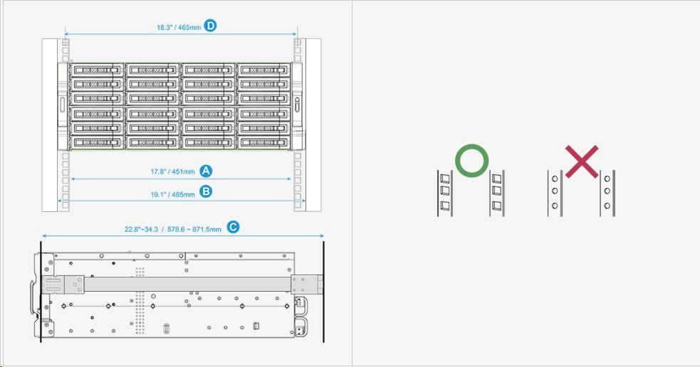 - Vzdálenost mezi dvěma rackovými sloupky (měření čtvercových otvorů racku střed-střed) je 18,3"(465 mm)