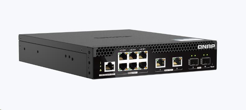 Model QNAP QSW-M2106PR-2S2T je řízený switch úrovně 2 s poloviční šířkou a montáží do racku a šesti 90wattovými porty 2,5GbE PoE++, dvěma 90wattovými porty 10GbE PoE++ a dvěma optickými porty 10GbE SFP+. Díky celkovému výkonu 310 wattů umožňuje model QSW-M2106PR-2S2T vybudovat vysokorychlostní a vysoce výkonnou síťovou infrastrukturu PoE pro přístupové body a routery Wi-Fi 6/Wi-Fi 6E/Wi-Fi 7. Systém QNAP Switch System (QSS), který nabízí uživatelsky přívětivé webové rozhraní, pomáhá správcům IT efektivně řídit sítě úrovně 2 a PoE, včetně bezdrátových přístupových bodů, IP kamer a Digital Signage, základních switchů a serverů. Zařízení QSW-M2106PR-2S2T nabízí malým a středním podnikům cenově příznivé a centrálně řízené řešení pro zavádění LAN. Díky poloviční šířce lze pro úsporu místa do prostoru racku 1U nainstalovat dvě zařízení QSW-M2106PR-2S2T. Zařízení QSW-M2106PR-2S2T se vyrábí na Tchaj-wanu (MIT) a poskytuje vysoce kvalitní a spolehlivé síťové řešení.