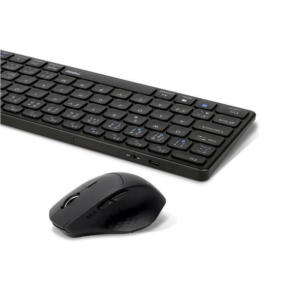 Tato ultratenká stolní souprava spojuje prvotřídní materiály s elegantní konstrukcí a pohodlím nezkrácené klávesnice. Díky pevné hliníkové základně je tělo klávesnice odolné a pevné. Zároveň dodá každému pracovnímu místu stylový punc. Klávesnice E9800M je nejen vyspělá konstrukcí, ale také funkcionalitou. Nabízí vícerežimovou technologii připojení firmy Rapoo – prostřednictvím spolehlivého bezdrátového vysílače 2,4 GHz, Bluetooth 3.0 a 5.0 – umožňuje současné připojení a přepnutí několika zařízení (s automatickým párováním). Myš v této sadě disponuje vysoce výkonným optickým senzorem, plně nastavitelným v rozsahu 600 až 1600 DPI a tichými spínači. Kromě toho je klávesnice vybavena ekologicky šetrným dobíjecím akumulátorem tak, abyste si mohli plně vychutnat volnost bez kabelů.