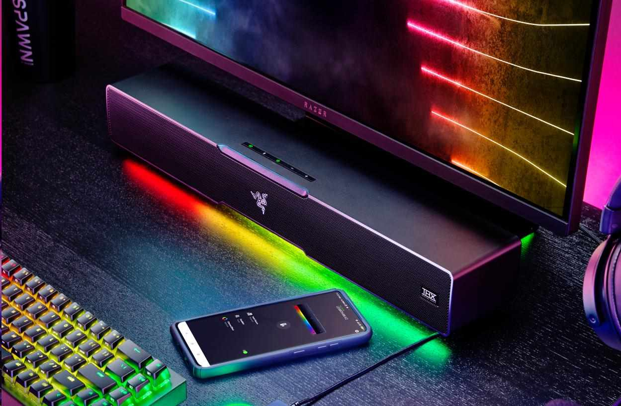 | OTHERS | Razer Chroma™ RGB (18 zones) THX Spatial Audio (PC based via Synapse 3) Bluetooth 5.2 (60ms low latency) USB audio input Razer Audio app Razer Chroma RGB app Custom 10-band EQ Raised feet on soundbar Headphone quick toggle Dimensions: Soundbar: 19.7 x 3.6 x 3.3" / 500 x 91.3 x 84 mm Subwoofer: 8.67 x 8.67 x 9.5" / 220 x 220 x 241.5 mm |