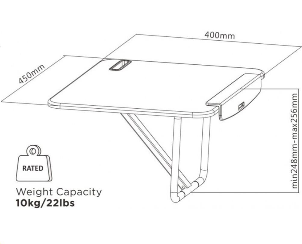 ERGOnomická pracovní plocha na laptop a mobil max 10kg pro uchycení na opěrnou část pracovní židle, jednoduché řešení pro změnu pozice při práci s laptopem ze sezení na stání, nastavení optimálního náklonu opěrným mechanizmem, přenosné provedení, rozměry 45x40x26 cm, barva černá.