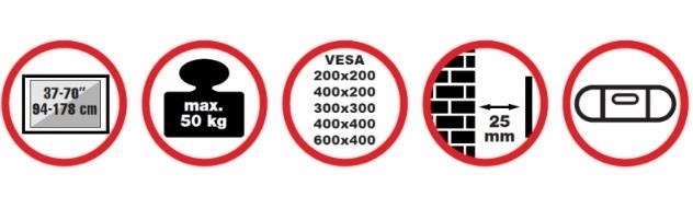 Nástěnný ocelový držák na Plasma a LCD TV s uhlopříčkou 37"- 70" (94-178cm) a hmotností maximálně 50kg. Konzole na zavěšení TV s vodováhou, není vertikálně výklopný, vzdálenost od stěny 25mm, materiál ocel, cenově výhodné, barva černá. Uchycení VESA: 200x200, 400x200, 300x300, 400x400, 600x400..
