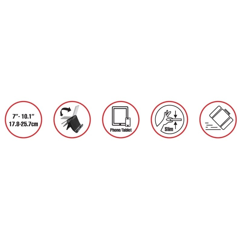 Stojánek pro tablety 7-11" v horizontální i vertikální poloze na stůl. Plynule nastavitelný sklon, robustní kovová konstrukce, minimální rozměr SLIM ve složeném stavu pro snadný transport, opření tabletu na spodní hraně, nahliníkové provedení, sříbrný..