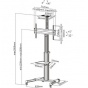 Moderní televizní stolek na Plasma a LCD TV s uhlopříčkou 37"- 70" (94-178cm) a hmotností maximálně 50kg. Středová teleskopická nosná tyč na kolečkách, držák otočný o 90° a vertikálně výklopný +5°/-12°, horní výškově nastavitelná plocha pro kameru, polička, AluDesign, barva stříbrná. Uchycení VESA: 200x200, 300x300, 400x200, 400x400, 600x400..