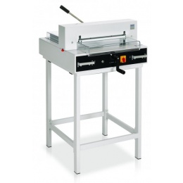 Pohodlné a přesné řezání do formátu A3, délka řezu 430 mm, elektromechanický pohon nože a digitální zobrazení míry zadního dorazu. Hloubka vložení stohu 435 mm, výška stohu 40 mm. Made in Germany. Bezpečnostní vybavení: spuštění řezu oběma rukama elektronicky jištěný, transparentní bezpečnostní kryt na předním stole transparentní bezpečnostní kryt na zadním stole automatický zpětný chod nože z každé pozice hlavní vypínač a bezpečnostní zámek s klíčkem snadná a bezpečná výměna nože z přední strany bez nutnosti sundání krytů řezačky pomůcka pro výměnu nože s ochranným krytem ostří nastavení hloubky zářezu nože (z venku) jednoduché otočení / výměna řezací lišty (z venku) Základní vybavení řezačky: elektromechanický pohon nože manuální rychlý pákový lis vřetenový posuv dorazu (ruční klikou) digitální zobrazení míry zadního dorazu (mm/palce) přesný zadní doraz optické vyznačení místa řezu nůž z kvalitní oceli Solingen nastavitelná hloubka zářezu nože standardně dodáváno jako stolní zařízení volitelné příslušenství – podstava (doporučujeme) nebo skříňka.