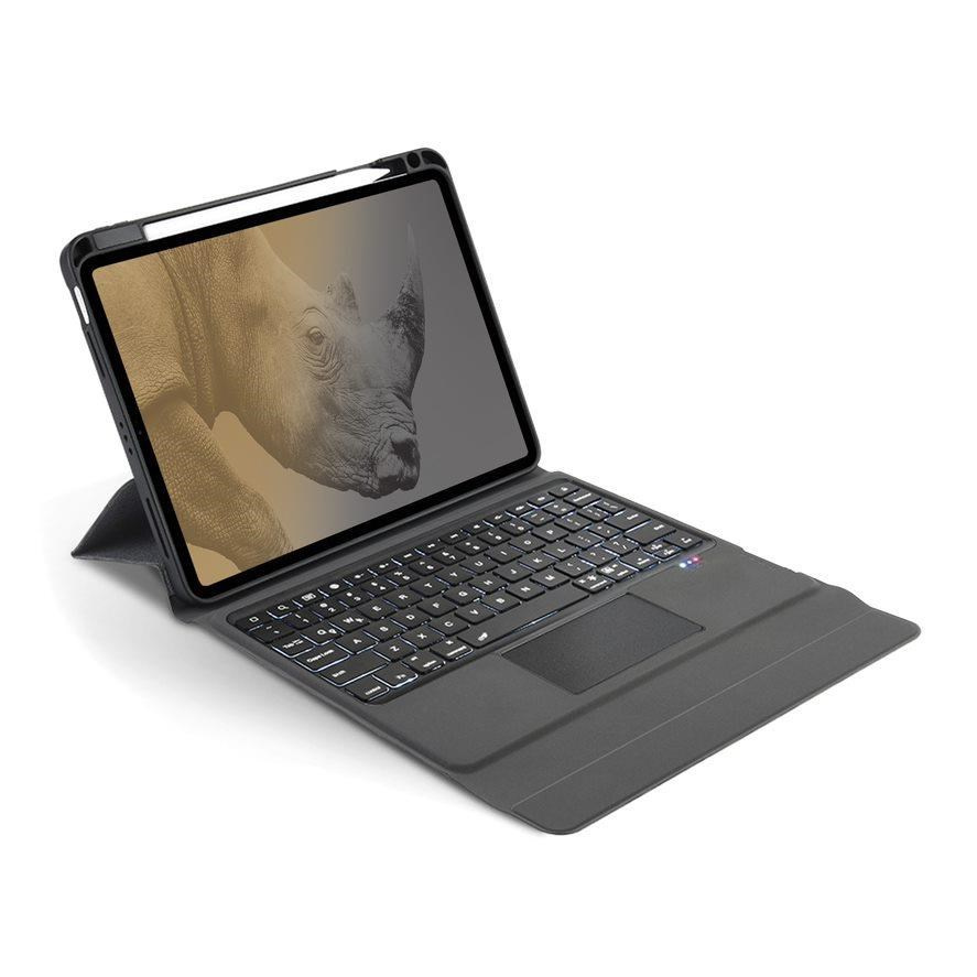 Velikým benefitem je zabudovaný touchpad, díky kterému si při práci vystačíte i bez myši. Mezi další skvělé vlastnosti patří RGB podsvícená klávesnice s možností regulací / vypnutí / zapnutí podsvitu, záda krytu s odvodem tepla a integrovaný držák na Apple Pencil. Pouzdro jednoduše použijete i jako stojánek při práci na stole, a naopak v zavřeném režimu udrží pouzdro zavřené silný magnet.