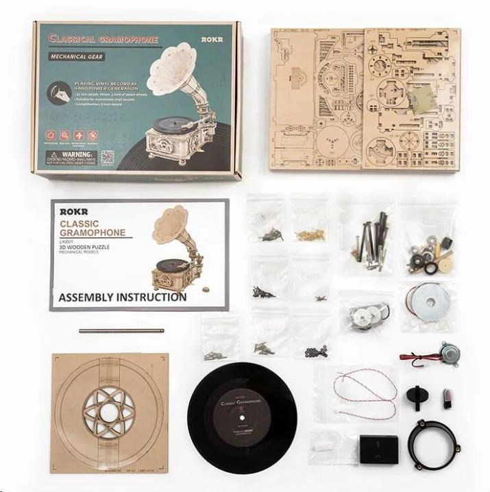 Jak zní historie? Stavebnice gramofonu z překližky. Retro designem, inspirovaným gramofonem vynalezeným Thomasem Edisonem, Vás přenese do 19. století. Není to jen model, skutečně umí přehrávat desky a je k němu i dodávána 7" gramodeska obsahující trojici písní (The Merry Gent, Memory Of A Dance, The Giant Killers). Zařízení disponuje ručně, klikou, poháněnou mechanikou a dynamem. Je možné jej ale pohánět i elektricky, pomocí vestavěného micro-USB konektoru. Podporuje desky o rozměrech 17,5 cm (7") a 25 cm (10") a všechny jim odpovídající rychlosti přehrávání. Hlasitost reprodukce lze upravovat pomocí otočného ovladače. Jedinečný dárek pro všechny milovníky kutilství a hudby, ale také luxusní interiérová dekorace do pokoje či kanceláře. Skládačka je dodávána v nesloženém stavu, balena v krabici. Vybaveno detailním návodem k sestavení.