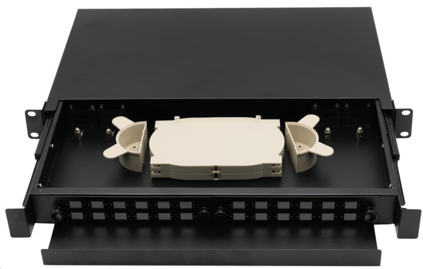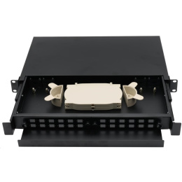 19" rozvaděč, výška 1U, pro 24 simplex adaptérů SC nebo duplexních LC, barva černá, kovová skříň, kazeta na svarky. Vana se vysouvá pomocí pojezdových kolejnic.