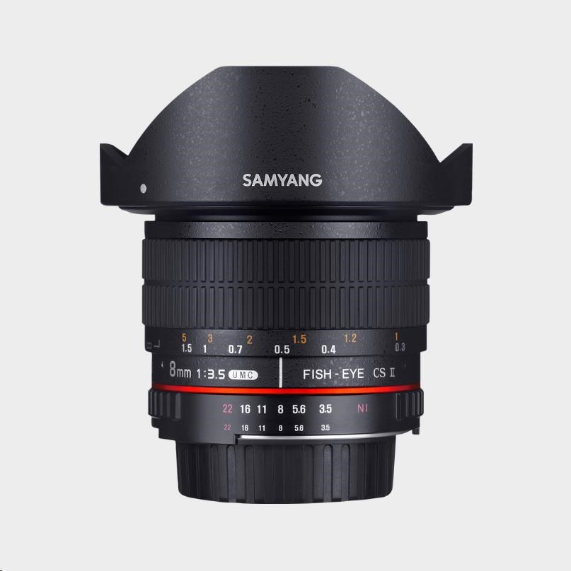 Objektiv Samyang 8mm f/3.5 UMC Fish-Eye CS II je speciálně navržený pro digitální zrcadlovky s APS-C snímačem, ale může být použit také na full frame fotoaparátech s odstraněnou sluneční clonou z objektivu. Na full frame fotoaparátech poskytuje Samyang 8mm f/3.5 Fish-Eye široké zorné pole, což je ideální pro panoramatické snímky a 3D virtuální prohlídky.