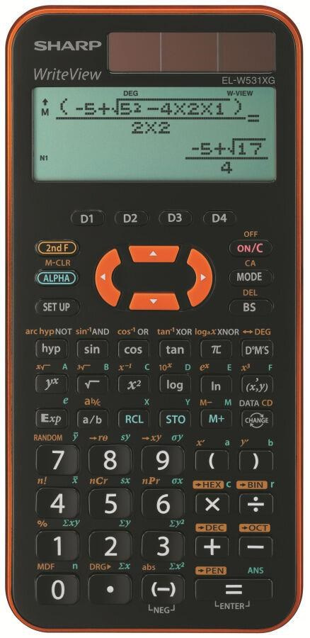 Vědecká kalkulačka EL-W531XG obsahuje 335 matematických funkcí a je vhodná zejména pro studenty středních škol. Bodový displej „WriteView“ umožňuje zapisovat a zobrazovat výrazy v obvyklém matematickém vyjádření, tj. jako na papíře. Solární napájení šetří záložní baterii a pevný plastový kryt chrání kalkulačku před poškrábáním a pády. K dispozici ve třech barevných variantách, s oranžovým, růžovým nebo fialovým rámečkem.