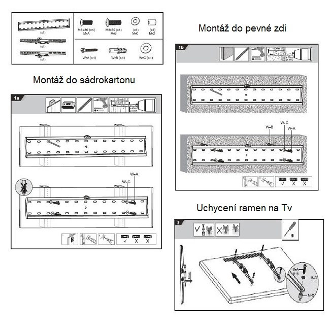 Sklopný televizní držák Fiber Mounts M6C68 Nástěnný držák pro zavěšení Tv 37-70", vzdálenost od zdi 53mm, nastavení náklonu +12° až do -12°, VESA 100x100 až 600x400, nosnost 40kg Hledáte kvalitní naklopitelný nástěnný držák pro zavěšení televizoru s úhlopříčkou 37" až 70" ? Chcete držák velmi dobré kvality za příznivou cenu? V tom případě Vám doporučujeme sklopný Tv držák Fiber Mounts M6C68 pevnou konstrukcí, která unese televize s hmotností až 40kg. Držák podporuje VESA standardy 100x100 až 600x400, má vzdálenost od zdi 53mm a umožňuje nastavení Tv do potřebného náklonu od +12° až do -12°. Pro snadnou a rychlou montáž je držák osazen vodováhou a je dodávám včetně instalačního materiálu. Barevné provedení černé. Záruka 5 let. Naklápěcí nástěnný držák na televize 37-60" Fiber Mounts M6C68 Technické údaje: nosnost 40kg podporuje VESA standard 100x100 až 600x400 doporučujeme na televizory s úhlopříčkou 37" až 70" odsazení obrazovky od zdi 53mm náklon +12° až -12° snadné zajištění sklonu v požadované poloze držák M6C68 je osazen vodováhou pro rychlejší a snadnější instalaci dodáváme včetně montážního materiálu (hmoždinky, vruty, šrouby) bezpečná velmi pevná konstrukce z oceli snadná a rychlá montáž barva černá záruka 5 let Integrovaná vodováha na Tv držák M6C68 pro snadnější instalaci na zeď Instalační materiál, který je součástí balení Tv držáku M6C68 Držák na televize M6C68 podporuje VESA standardy: VESA 100x100 VESA 200x100 VESA 200x200 VESA 300x200 VESA 300x300 VESA 400x200 VESA 400x300 VESA 400x400 VESA 600x400 Nástěnný sklopný Tv držák M6C68 je vhodný pro zavěšení veškerých značek, typů i velikostí televizí, které podporují kterýkoliv z výše uvedených VESA standardů a jejichž hmotnost není vyšší jak 40kg. Samotná montáž držáku je stěnu je velmi snadná a zvládne ji i naprostý laik..