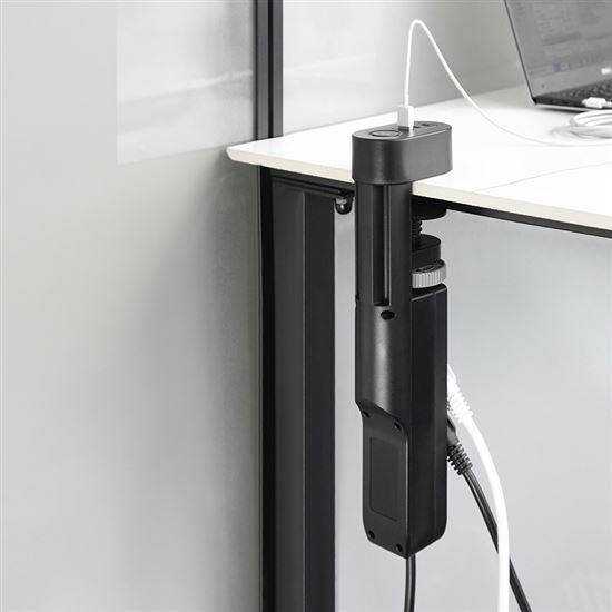 možnost upevnění i v opačném směru, 230V zásuvky nad stolem a USB pod stolem