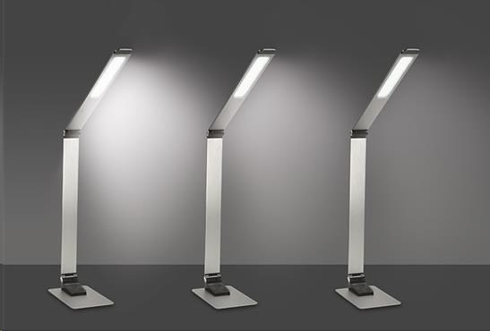 stolní lampička z broušeného hliníku s LED světelným zdrojem volitelná teplota světla (chromatičnosti): 3000K, 4500K, 6000K (teplá, neutrální a studená bílá) stmívatelná: 3-stupňové stmívání příkon: max. 11W světelný tok: max. 550lm USB zdířka pro nabíjení telefonů (5V, 1000mA) USB kábel súčasťou spínání a změna jasu dotykem prstu napájení: vstup: AC 100-240V výstup: DC 12V energetická třída: A+ LED zdroj nelze měnit materiál: hliník síla stěny: 6mm rozměr: 393 x 120 x 450mm délka napájecího kabelu: 140cm barva: stříbná.