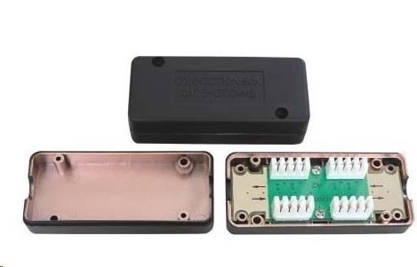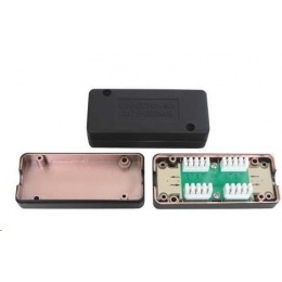 Propojovací box Cat6a, stíněný pokovením. Umožňuje propojit kabelové segmenty beze ztráty kvality vedení. Narážecí kontakty.