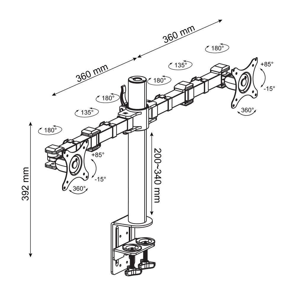 Stolní držák na 2 monitory Ergosolid NF12 Stolový držák na 2 monitory 10-30", otočný +/- 180°, sklopný +85°/-15°, pivot, nastavení výšky 20-34cm, délka ramen 36cm, VESA 75x75 a 100x100, spolehlivý stolní úchyt 20-100mm, nosnost 20kg Stolový držák pro spolehlivé zavěšení dvou monitorů a jejich nezávislé nastavení. Držák vyniká svou kvalitou, spolehlivostí a snadným polohováním zavěšených monitorů. Velmi snadno nastavíte výšku monitorů (bez použití nářadí), náklon, otáčení do stran, rotaci obrazovek (otočení na šířku nebo na výšku), korekce roviny obrazovky. Nosník držáku je uzpůsoben pro vedení kabeláže, vývod je nad stolovou deskou. Uchycení držáku je možné na okraje všech stolových desek o průměru 20mm až 100mm. Držák je vhodný pro zavěšení monitorů s úhlopříčkou 10" až 30" s hmotností až 10kg (celková nosnost 20kg). Barevné provedení černé. Záruka 3 roky. Stolový držák na 2 monitory Ergosolid NF12 Technické údaje: celková nosnost 20kg na monitory s úhlopříčkou 10" až 30" podpora VESA standardů 75x75 a 100x100 nastavitelná výška 200-340mm nezávislé nastavení každého monitoru otáčení do stran +/- 180° náklon +85° až -15° funkce PIVOT - otočení monitoru na šířku nebo na výšku nastavení vzdálenosti monitoru od úchytu délka ramen 360mm 3 spolehlivé klouby pro nastavení požadované pozice každého ramene materiál ocel uchycení na okraj všech stolových desek o průměru 20mm až 100mm barevné provedení černé balení obsahuje instalační materiál záruka 3 roky Kvalitní stolní držák pro uchycení a polohování 2 monitorů Ergosolid NF12 Držák podporuje VESA standardy pro uchycení monitorů: VESA 75x75 VESA 100x100 Stolní držák na 2 monitory ERGOsolid NF12 je vhodný pro zavěšení všech dostupných značek monitorů. Držák je vhodný na monitory Acer, AOC, Asus, BenQ, Dell, Eizo, Fujitsu, Hanspree, HP, iiyama, Lenovo, LG, Marshall, MSI, NEC, Neovo, Panasonic, Philips, Samsung, Sharp, ViewSonic, All in One PC a další. Díky výborné kvalitě, odolnosti a spolehlivosti se tyto držáky osvědčili pro použití i v náročných provozech: školní učebny, knihovny, nemocnice, provozy a výrobní haly ve firmách..